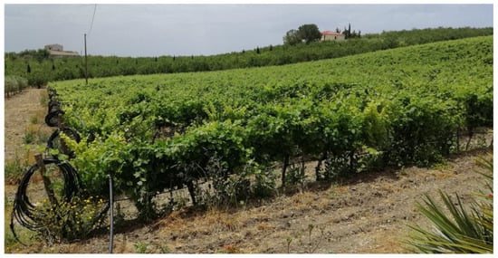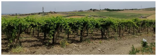 - plot having an area of 1 ha ca., where the vine variety Nero d’Avola is cultivated, using the fruit tree form marquee with plant distances of 2.8 × 2.8 m (Figure 2).