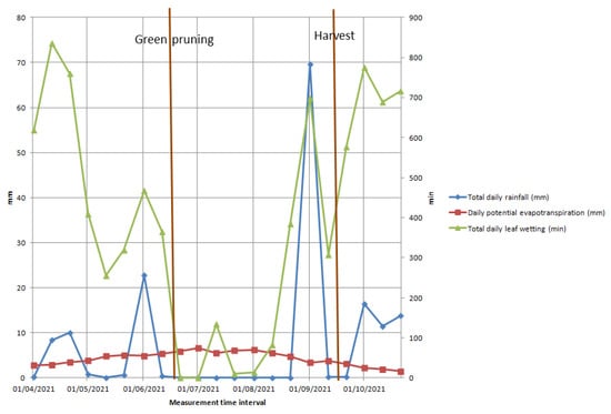 Fertilisation is also carried out in the Nero d’Avola plot during winter, e.g., between 14 and 24 February 2021, by applying the rate of 1000 kg ha−1 of the above organic fertiliser, followed by no irrigation. Green pruning was carried out only in the Nero d’Avola plot in June.