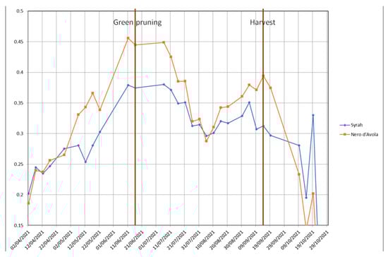 In the graph of average NDVI (Figure 4), it is possible to observe a similar trend for both plots (i.e., vine cultivars). In fact, the plant vegetative vigour highly increases from April to June and decreases at the beginning of June, more so in the Nero d’Avola cultivar rather than the Syrah one, as a consequence of green pruning, carried out in this month only in Nero d’Avola plot—where it caused a reduction of vegetative vigour. Then, the vegetative vigour becomes almost constant between mid-June and the beginning of July and decreases in July, as the productive activity (i.e., grape ripening) is prevalent on the vegetative one and the high temperature causes plant water stress. Finally, the vigour increases in August, as a slightly lower temperature causes lower plant water stress. It suddenly decreases in September, because the rest period (i.e., plant senescence or low vegetative activity) starts before for Syrah cultivar (harvested on 9 September) and after for the Nero d’Avola variety (harvested on 21 September).