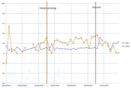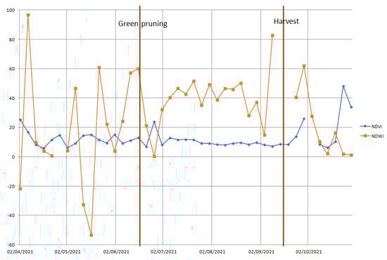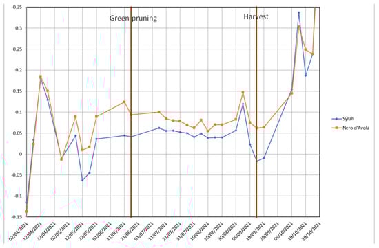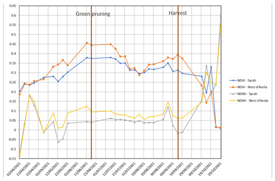 In the graph of average NDWI (Figure 5), it is possible to observe an almost identical trend for both plots (i.e., cultivars), even if Nero d’Avola cultivar has a higher plant leaf water content rather than Syrah during most of the surveyed period, meaning that the former has lower water stress rather than the latter. In fact, the plant leaf water content increases in the first half of April, due to the last rains of the season, and decreases in the second half of this month. Then, the leaf water content increases, decreases and increases in May—as a result of the rain distribution in this month—becomes almost constant in June, slightly decreases in July and increases in August. Finally, the leaf water content decreases in the first half of September and then suddenly increases because, even if the rest period starts, vine plants keep their leaves during winter but low temperature causes low transpiration.