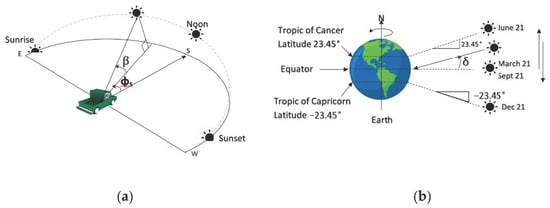 The position of the sun can be described using SAA (β) and azimuth angle (φs) (Figure 1a). The SAA illustrates the sun′s height at any time. Using the latitude and longitude of each point on the Earth, the altitudes and azimuth angles could be calculated at any time of the day. To calculate SAAs, declination angle and hour angle must be calculated. The declination of the sun (δ) is the angle between the equator (centerline) of the Earth and the line drawn from the center of the sun to the center of the Earth as shown in Figure 1b [28]. This angle varies from −23.5° to +23.5° due to the declination of the polar axis of the Earth and the Earth′s circulation around the sun.