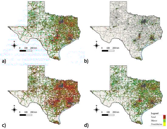 Spatial distribution of two years’ crashes in Texas under different lighting conditions: (a) dark; (b) dark lit; (c) daylight; (d) twilight [39].