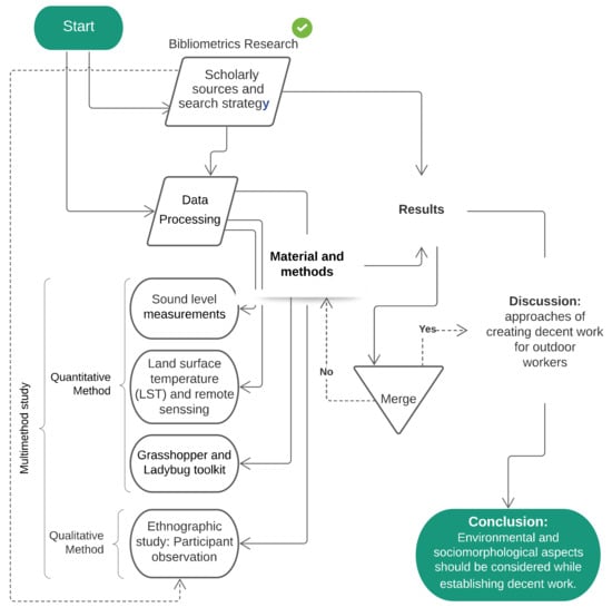 A multi-method design was applied to examine the impacts of the factors influencing outdoor worker productivity, satisfaction, and decent work conditions. Then, a case study was conducted for which field measurements were taken. A sound level meter was used to make sound level measurements (SLMs) and measure sound tolerance levels and sound pressure; in addition, remote sensing and the Grasshopper and Ladybug plugins were used to measure heat exposure and UHI effects on workers’ satisfaction. Based on participant observations in the selected area, an ethnographic study on the distribution of worker activities in the outdoor environment was conducted, whereafter the participants completed an online survey to determine the factors affecting worker satisfaction. Finally, the contextual factors related to UHI and NE affecting outdoor workers were investigated.