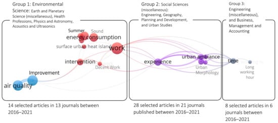 In the bibliometric data curtain, we searched the SJR database using the keywords “climate”, “decent work”, “labor”, “noise”, “performance”, “productivity”, “satisfaction”, “sound”, “surface temperature”, “urban heat island”, “workplaces”, and “workers”, which were in the three areas of expertise published from 2016 to 2021. Search results had one or more keywords in the title, abstract, and/or keywords. Articles were selected according to the relevant ones published by highly indexed journals in the first quartile (Q1) and second quartile (Q2) based on the impact factor of the journal and citations, which yielded 195 manuscripts. The results excluded materials from journals from outside of environmental science, management, and social sciences, such as the Journal of Applied Physics Reviews. Furthermore, the selection excluded manuscripts from the subject areas of physics, computer science, and plant science. The results yielded 50 manuscripts. To examine the results obtained, this study used VOSviewer Software to group the topics into three groups of topics, with a minimum cluster size of 1 and a repulsion of 1. All the detailed findings for these three groups are illustrated in ‘data availability statement’.