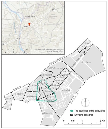 To verify the research questions, a case study was conducted in Al-Weili District, Cairo (Figure 3). This district is divided into neighborhoods or Shiyahka, according to Egyptian urban structure. Communally, the citizens call the entire district Abbassia. The study area site boundaries were selected on the basis of the outdoor environment worker activity distributions.