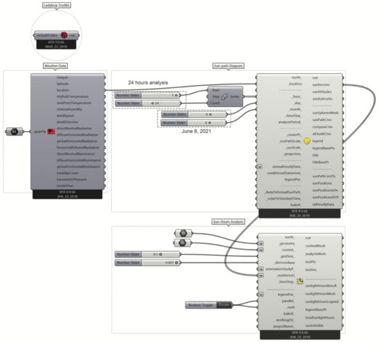 There are now several methods and techniques available to measure heat tolerance in outdoor environments [55,56,57]. This study used Rhinoceros software (version 6.0 copyrights) for the modeling and construction template to determine the heat exposure and used the Grasshopper and Ladybug toolkit as the engine to deal with the 3D geometry and simulation parameters. As in previous research, Grasshopper was utilized to produce the generative algorithms needed to generate the 3D geometry for the case study [58,59]. The data entry for this software comprises individual components that can be dragged and dropped on a “canvas”, whereupon the outputs for one component are connected to the inputs of another component.