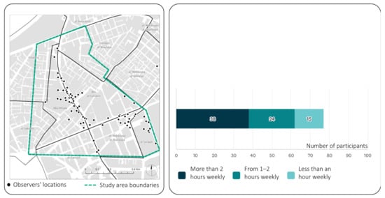 The purpose of the participant observations was to assess the impact of the physical environment on satisfaction, which can affect productivity. A sample of voluntary participants with at least a two-year familiarity with the site was selected from the institutions near the study area. The selected participants were required to observe the working community to gain an understanding of their satisfaction with the workplace environment. The authors of this work invited students in their classes during the semester of Spring 2021 as volunteers to be part of data collection. The participant invitation criteria were based on including a minimum age of 20 years, an awareness of the workers’ communities, and a familiarity with the site based on their regular visits during their university study. These criteria ensured that subjective data could be collected through personal interactions with the participants as well as access to the working community. Finally, 77 participants out of the 123 students invited in this volunteer task, that is, 37 architects, 23 landscape architects, 8 urban designers, 7 urban planners, and 2 mechanical and civil engineering participants—were selected, each of whom observed the site for 2 h (weighted average).