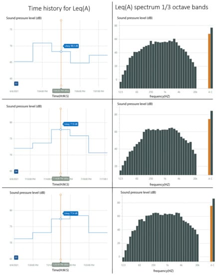 The M03 field measurement showed that the sound level was higher (Leq = 67.88 dB) than the required level of 50 dB. The M04 measurement in Ahmed Said Street, which has vending machine workers, and which is attached to a residential area with commercial activities, was higher (74.81 dB) than the required level of 50 dB, and in M05, the sound level was also higher than the required level at 75.54 dB. Figure 7 shows the time history Leq(A) and Leq(A) spectrum 1/3 octave bands in each zone.