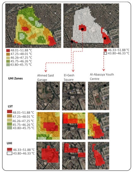 The solar radiation and UHI analyses found workers at the study area exposed to heat at several places: Ahmed Said Garage, El-Gesh Square, and Al-Abassya Youth Centre (Figure 8). A common feature of these three places was large open areas of asphalt and concrete. The asphalt had a low albedo value of 0.125 [56]. As Ahmed Said Garage has a massive area of asphalt for vehicle parking, both the asphalt area and the vehicles store heat and re-emit it, which creates a heat island effect. The precast concrete used in the youth center playground plays a significant role in increasing the zone’s surface temperature and UHI effect, as the albedo value of the concrete was 0.25. Finally, El-Gesh Square is an open asphalt space and suffers from traffic congestion, both factors in increasing its surface temperature.