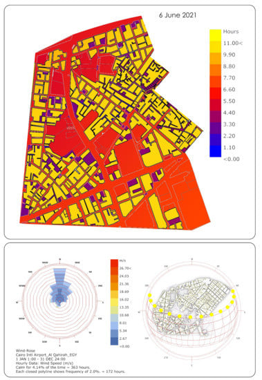 In this study, the Grasshopper and Ladybug plugins were used for the environmental analysis and the measurement of outdoor thermal comfort (Table 3), and a weather file was imported into the program. The file used in the case study was developed from the Egyptian Typical Meteorological Year. The expected results from the microscale human outdoor heat exposure platform were used to build the main model and determine the simulation parameters. A simulation was then conducted to draw the sun path diagram and conduct the sun-hour and wind analyses on 6 June 2021.