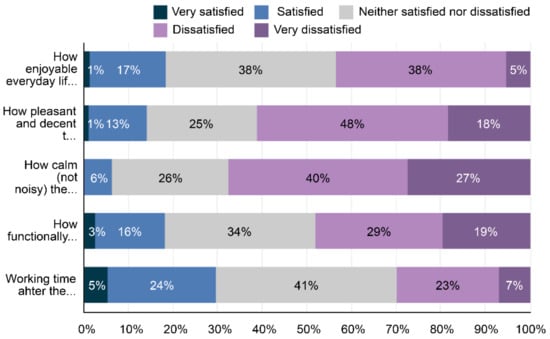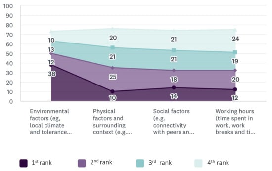 Few comprehensive outdoor working environment studies have focused on worker satisfaction [2,31,32]. However, the few studies that have considered satisfaction factors have identified physical factors, such as building and space design [33], and non-physical factors, such as temperature [8], noise [2], and air quality [17]. In addition, studies have found suitable outdoor workplace environments to be convenient, flexible, and visually appealing to the employee [34] to encourage worker concentration, a sensory and physical connection to their work roles, and engagement with the context and their peers [35].