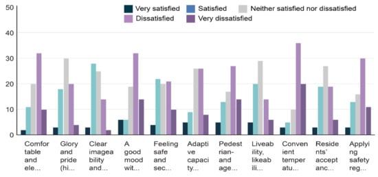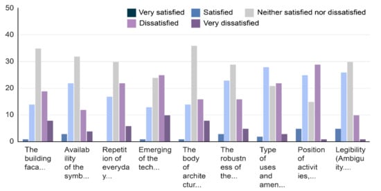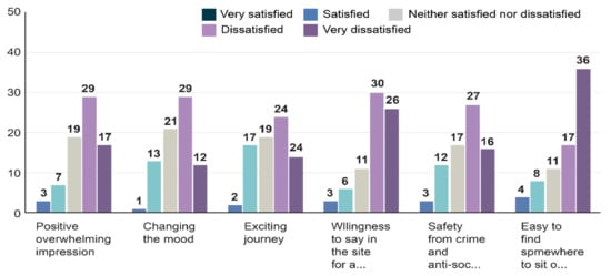 The first question group consists of six questions. This set of questions asked participants for general information regarding their academic background, the location from where they observed the outdoor workers and the types of workers they observed, and a general question focusing on the duration of the site observation. Building upon our bibliometrics analysis derived from the SJR database, the second group of questions had four questions focusing on overall satisfaction, the decent outdoor environment (DOE) [40], socio-morphological tangible characteristics (SMTC) [33,36], and the response indicators to the intangibles (RII) [60]. The third group of questions asked the participants three questions. The first was about the factors they felt affected the affective atmosphere as visitors to the sites. The second was how likely the observers were to recommend a business at the site. The last question in this group was whether they had any other comments about the site condition and its effect on worker productivity.