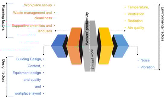 Nine main characteristics have been identified as contributing to the idea of decent work: (1) work stability and security; (2) adequate compensation and productive work; (3) reasonable work hours; (4) balancing work, (5) family, and (6) personal life; (7) equal opportunity and treatment; (8) a safe work environment; (9) and social security. Previous studies have also concluded that good outdoor working environments that consider temperature or noise levels can result in higher worker productivity and satisfaction [8,12,30].