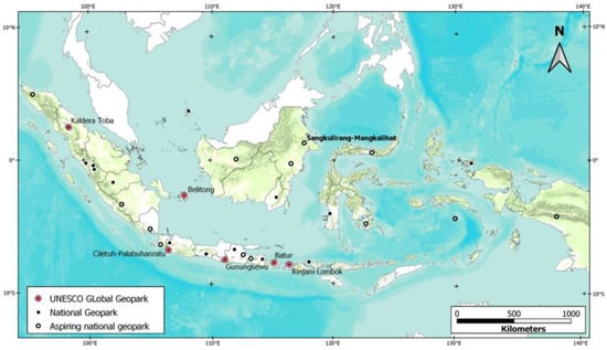 In Indonesia, geopark development began in 2010 when the Ministry of Tourism established six geopark areas, namely Toba, Merangin, Rinjani, Gunung Sewu, Batur, and Raja Ampat, as national geoparks [20], of which some now have developed into UNESCO Global Geoparks (Figure 1). This development is a response to the national policy which recognized Geoparks through the Presidential Decree Number 9 Year 2019 on Geopark. Currently, Indonesia hosts six UNESCO Global Geoparks and 13 national geoparks, as well as several aspiring geoparks (Figure 1), of which the Sangkulirang-Mangkalihat aspiring geopark (see Figure 1) is currently encouraged by the government and diverse practitioners to be established as a UNESCO Global Geopark.