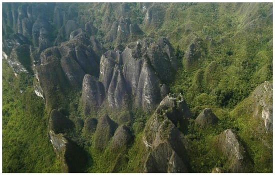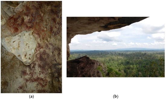 Sangkulirang-Mangkalihat karst ecosystem (Figure 5) is located in the province of East Kalimantan, specifically in Berau and East Kutai Regencies with a total area of 1,867,676 ha hectares according to the East Kalimantan Governor Regulation No. 67 Year 2012 out of the total 15.4 million ha of karst across the country [46]. The area enjoys a tropical climate. Out of this total karst area, as much as 403,151.89 ha is delineated as a geological protected area [25]. The area is also inhabited by 120 species of birds, 200 species of arthropods, including insects, 300 species of flora, and 50 species of fish and is the main habitat for endemic animals of Borneo, namely the Bornean orangutan [47]. Pinnacle karst and numerous cave systems are among the uniqueness of the area. The Sangkulirang-Mangkalihat karst features hilly terrain, steep cliffs, and underground caves. The caves in this area have unique features, such as cave paintings (rock art) and different types of animal images that have archaeological significance [48]. Owing to the possession of 240 pieces of rock art distributed over the entire roof of the cave, radiocarbon dating indicates that rock art in the Tewet cave in Sangkulirang-Mangkalihat karst is 40,000 BP (40 ka). It is considerably older than the Lascaux cave (35,400 BP) and the Chauvet cave (32,000) in France [48] and the karst area was presumed as the initial location for Austronesian humans to enter [49,50]. Furthermore, the maximum date for the earliest cave painting phase in the Sangkulirang-Mangkalihat Peninsula is 51.8 ka [26], and this also indicates the oldest cave paintings made by prehistoric modern human.
