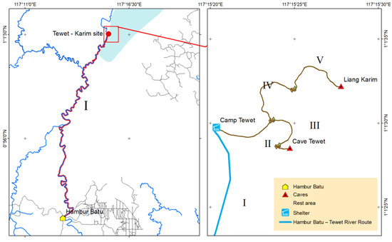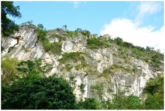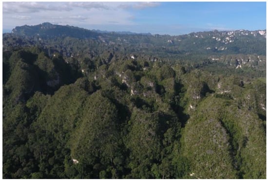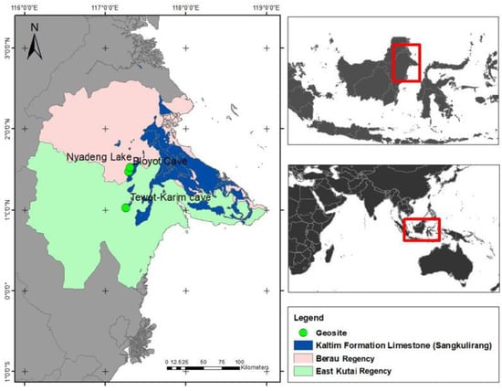This study was carried out in Sangkulirang-Mangkalihat karst in the East Kalimantan Province of Indonesia. The karst is located on the Mangkalihat Peninsula, east of Kalimantan Island (Figure 3). The people and residents of the surrounding karst area have used it from generation to generation as a housing site to search for swallow nests and water resources. This karst area is protected under the Government Regulation Number 67 of 2012 concerning the Protection and Management of Sangkulirang-Mangkalihat Karst Ecosystem in Berau and East Kutai Regency [25,40].