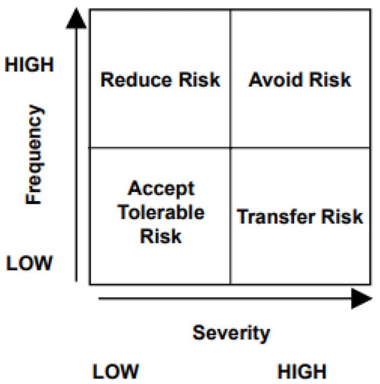 The potential risk level is derived by mapping the calculation results of the risk level matrix (Table 3). The options for managing hazards were identified based on the risk assessment provided by APEC [36]. There are four risk reduction management options offered to improve management, namely reduce, avoid, retain, and transfer risks (Figure 4).