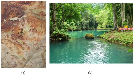 Geosites that have been developed in the village of Merabu: (a) Rock art of hand print, and human at Bloyot cave; (b) Nyadeng lake.