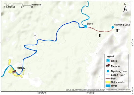 The Merabu Karst area is approximately 8000 ha [51]. Topographically, it is a lowland on the border of Lesan River, as well as karst plains and karst hills. Merabu is a karst area that is more developed in terms of both exokarst and endokarst. This development is characterized by the presence of both exokarst and endokarst morphological features and hydrological characteristics. The presence of exokarsts in the case of Merabu indicates the formation of tower hills, while the presence of endokarst features indicates the existence of caves. One of the caves with cultural value is the Bloyot cave. In this area, there is a phenomenon of a karst pool filled by springs of large discharge, with a depth of 40 meters, passing through below the water level of the Lesan River. The pool is clear and is called Telaga Nyadeng (Nyadeng lake). In the Merabu perikarst zone, it is very easy to find springs and small rivers that go in and out of these karst hills. The alluvial soil between the hills is relatively flat and contains dense forest. The Meranti tree stands straight and fairly tight, and many ironwoods can be seen standing big and tall.