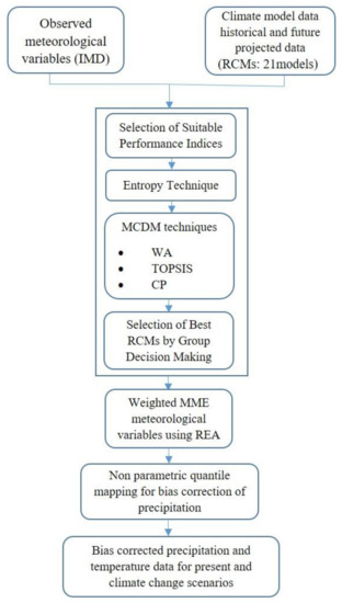 Several approaches are used to evaluate and rank RCMs’ ability to match the actual climate. The RCMs are ranked using different sets of performance indicators. Based on the literature review mentioned in the introduction, the performance indicators in the current study were root mean square deviation (RMSD), normalized root mean square deviation (NRMSD), absolute normalized mean bias deviation (ANMBD), Pearson correlation coefficient (CC), Nash–Sutcliffe efficiency (NSE) and skill score (SS). For the calculation of performance indices, average monthly precipitation and temperature data sets of observed (IMD) and simulated (RCM) values are used for the period 1951–2005. Table 1 shows the mathematical equations for each indicator as well as their ideal values. The observed and simulated values of the respective datasets are xi and . The mean of observed and simulated values are denoted by and . The number of datasets is denoted by . The standard deviations of observed and simulated values are denoted by and , respectively. The number of bins utilized in the PDF calculation for the given set of values is shown as . The frequency values in the respective bin from the chosen RCM and of the observed values are denoted by and . Methodology flowchart is shown in Figure 2.