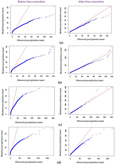 where is a cumulative distribution function (CDF), and is the corresponding quantile function (inverse CDF). The subscripts and indicate the parameters of the distribution that correspond to observed and simulated data, respectively. Non-parametric quantile mapping was applied using a correction table of the two CDFs (observed and simulated), and a linear interpolation was applied between the two percentiles. The sub-basin average daily precipitation before and after bias correction is shown in Figure 3. It is observed from the Figure 3 that the modeled precipitation values were shifted towards observed precipitation values, before and after bias correction, using the non-parametric quantile mapping technique.