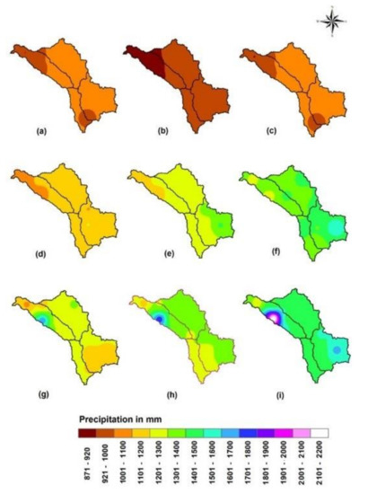 Spatial variation of average annual precipitation (mm) (a) IMD, Historic period (1950–2005) (b) before bias correction (c) after bias correction, under RCP 4.5: (d) 2021–39 (e) 2040–69 (f) 2070–99, under RCP 8.5: (g) 2021–39 (h) 2040–69 (i) 2070–99.
