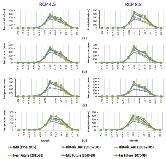 Daily precipitation data (1901–2020) and the minimum and maximum temperatures (1951–2020) were obtained from the Indian Meteorological Department (IMD), Pune, India [44]. Historic climate data are available in 0.25° × 0.25° grids for precipitation and a 1° × 1° grid for temperature. The bias-corrected, spatial disaggregated (BCSD) NEX-GDDP dataset includes downscaled projections for the RCP 4.5 and RCP 8.5 daily scenarios and is produced and distributed for 21 models as part of the Coupled Model Intercomparison Project Phase 5 (CMIP5). These datasets are available for the entire South Asian region on the website of the Indian Institute of Tropical Meteorology in Pune, India [45]. The CMIP5 GCM runs were created in support of the Intergovernmental Panel on Climate Change’s Fifth Assessment Report (IPCC AR5). Each of the climate projections includes daily precipitation, maximum temperature and minimum temperatures, and a spatial resolution of 0.25 degrees for the period 1950–2099. Table S1 contains Supplementary Material for each model driving the Atmosphere-Ocean General Circulation Model (AOGCM) and contributing modeling centers.