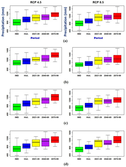 Figure 4 demonstrates the spatial variation of the annual average precipitation for different periods over the Munneru basin, clearly indicating the variation in future periods compared to the observed period. The Inverse Distance Weightage (IDW) interpolation technique is used to generate spatial plots. Table 8 represents the variations of annual average precipitation in different periods for the four sub-basins under two scenarios. When compared to the historic period, precipitation increased by 10%, 21% and 37% in the three future periods for the RCP 4.5 scenario, and by 23%, 30% and 45% for the RCP 8.5 scenario. However, the results differed from those of Sowjanya et al. (2018) [50], who worked in the lower Krishna river basin and used only five available RCM models. Within the Munneru basin, the S4 sub-basin under the RCP 4.5 scenario and the S1 sub-basin under the RCP 8.5 scenario had the greatest increase in precipitation in future periods when compared to the historic period. The monthly mean plots in Figure 5 show an increasing trend for all future periods, with no shifts in the precipitation pattern. In the study area, 90 percent of the annual rainfall falls during the monsoon (June, July, August and September) and post-monsoon (October and November) seasons. The RCP 4.5 scenario increased the annual average monsoon precipitation by 28, 34 and 51% in 2021-39, 2040-69 and 2070-99, compared to a 38, 43 and 55% increase in the RCP 8.5 scenario. Similar results were observed for the entire Krishna basin in 2041–2070 and 2073–2100 under the RCP 8.5 scenario [51]. Figure 6 and Figure S2 show box plots of average annual monsoon and post-monsoon precipitation for all periods under two scenarios.