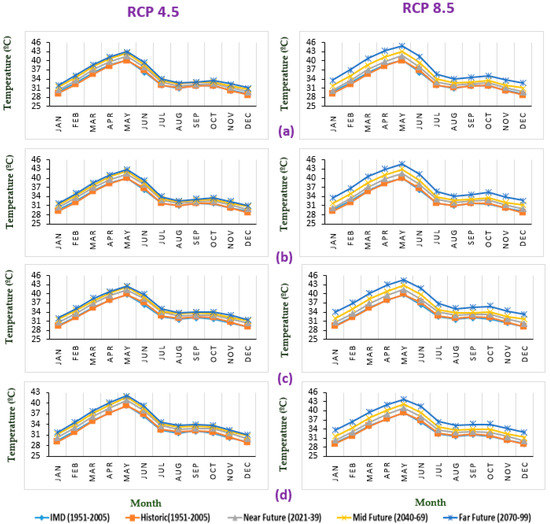 Sub-basin-wise mean monthly maximum temperature (°C) (a) S1 (b) S2 (c) S3 (d) S4.