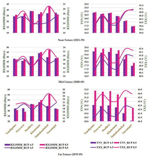 In the near future, Narsampet had a higher average monthly maximum value of daily maximum temperature (TXX) in summer, whereas Madhira had a higher value in the remaining two periods for both the RCP 4.5 and RCP 8.5 scenarios. Nandigama had a lower average monthly maximum value of daily maximum temperature in summer for all three future periods for both scenarios. The average monthly minimum value of daily minimum temperature (TNN) in winter was higher in Nandigama and lower in Narsampet for both the RCP 4.5 and RCP 8.5 scenarios in all three future periods.
