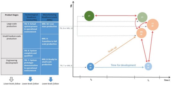 There is no sole method for scaling up, but an array of methods can be found []. Arvidsson et al. [] differentiated two main approaches for the modelling and process upscaling of the foreground system, namely, predictive scenarios or scenario ranges. The predictive method seeks to reflect likely technological developments, also taking into account the status quo. Scenario ranges include minimum and maximum extreme scenarios or even a grading scale. In this study, the applied upscaling methodology corresponds mainly to the predictive approach, as RF technology is well-founded at commercial scale.