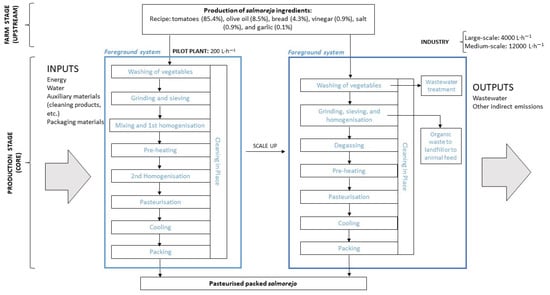 As stated in the introduction, industrial gazpacho processing is the same as that of salmorejo, except for the ingredients. The same industrial line is even often used for making either gazpacho or salmorejo. Thus, except the recipe, the same processing is considered for the upscaling (e.g., unit processes, equipment used, energy consumption, etc.). In addition, gazpacho is more commonly produced (in terms of the number of industries) and the output is greater (in tonnes per year) than that of salmorejo; thus, more information is available. Then, when specific information on the industrial production of salmorejo was not available (e.g., unit processes involved, product capacity of factories, etc.), data from gazpacho processing were used instead. However, as stated in the introduction, the production of salmorejo is already carried out at commercial scale; hence, the procedure relies not only on the pilot plant, which is usually the starting point, but also on current information from equipment manufacturers.