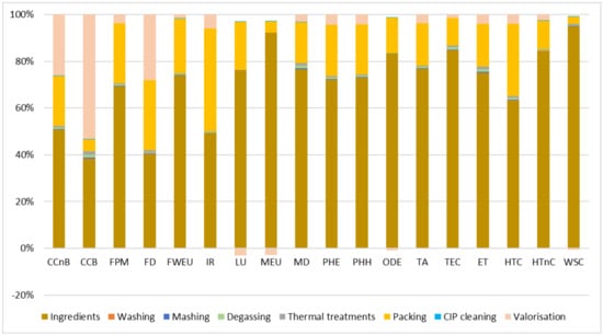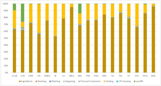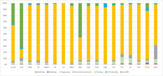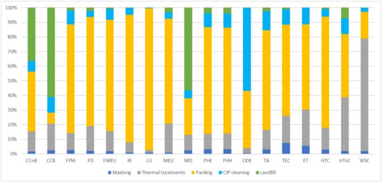 Food products are associated with relevant environmental impacts throughout their life cycle. Literature on food life-cycle assessment (LCA) shows that the agricultural stage is often the largest contributor to their total life-cycle impacts [], with food processing in second place, accounting for 28% of the total energy use in the EU []. In a review on energy usage within the food industry, Ladha-Sabur et al. [] highlight processes involving phase change (e.g., drying, freezing, etc.) as the most energy-demanding ones, although thermal treatments (pasteurisation, blanching, etc.), which are extensively used in the food industry, are also remarked as energy-intensive operations accounting for a large share of the energy consumption in food processing. However, such treatments play an important role in making fresh ready-to-eat meals long-lasting. The same review also remarks on the energy consumption associated to cleaning in dairy products [], while energy consumption for cleaning in other food products has not been accounted for. Process optimisation, and technological and manufacturing behavioural changes have been proposed to decrease energy consumption in food manufacturing [].