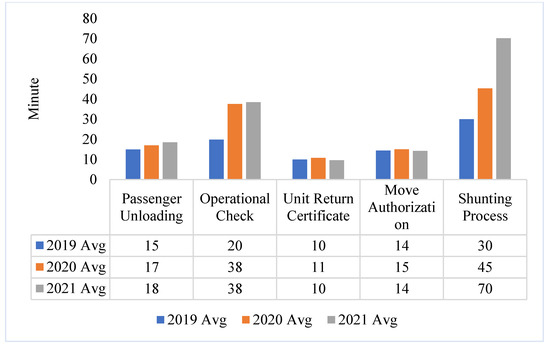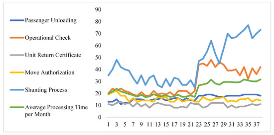 Figure 6 plots the processing times of the five processes over a period of 38 months. It is noted that the shunting process and the operational check are the two processes with the most increased processing times. More specifically, these two processes experience a spike in processing times immediately after the COVID shutdown as noted in Table 2. In addition, Figure 6 shows the average processing time of all processes, which is plotted in green. It is noted that both the shunting and operational check processes are above the average even before the COVID shutdown.