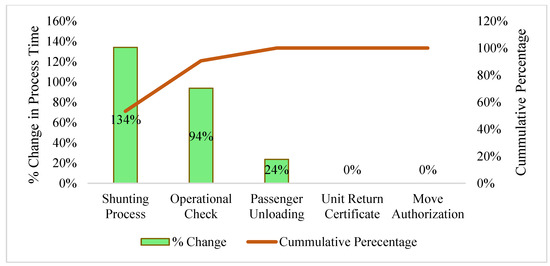 To show the significance of the change (% change) and to highlight the priority of the needed improvement, a Pareto analysis was implemented and is shown in Figure 5. As the Pareto principle states that 80% of consequences come from 20% of the causes, the analysis shows that our 20% of the causes comes from Process 6: Shunting Process. The “Analyze” phase will be conducted for Process 6 to understand the root causes of this delay.