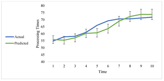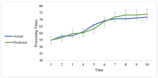 In addition, the previously mentioned linear regression predictor is used to estimate the two- and three-step-ahead predictions of the shunting process. It is noted that the prediction accuracy decreases relative to the increase in steps. Figure 8 shows the two-step-ahead prediction using the linear regression predictor. The general trend of the shunting processing times is captured using the predictor; however, the accuracy decreases, as shown in Figure 8.