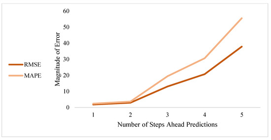 The previous table affirms the need for more data. In order to take advantage of more step-ahead predictions that are accurate, unlike the three- and more step-ahead prediction presented here, more data are needed for training. When moving from two- to more step-ahead predictions, it is noted that there is a significant decrease in prediction accuracy as measured by RMSE and MAPE, the error rates of which are plotted in Figure 9. After sustained data collection, the trained algorithms can be utilized to predict shunting process times in newly established train lines using similar methods.