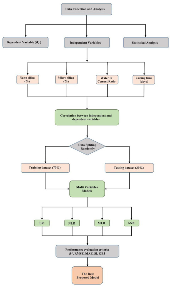 Although compressive strength relies on several parameters, it is also sensitive to the mixed proportion, so using more sophisticated model techniques in combination with simplified tools and numerical equations is beneficial for engineers and helps reduce the number of laboratory experiments required. Multivariable models may be regarded as an excellent solution in this respect. The primary advantage of these methods is that they enable the development of alternatives and solutions for linear or nonlinear issues in which mathematical models cannot easily explain the connection between the components [30]. Several models for predicting cement-based materials and multi-linear regression analysis models are widely employed [31,32]. This research aims to develop, characterize, and recommend a multiscale model for predicting the compressive strength of cement paste improved with NS and MS. In this respect, the extracted dataset was extensively tested using different modelization approaches to (i) conduct a comparative study and investigate the impact of varying mix formulations, such as NS and MS, as well as the w/c and curing time, on the compressive strength of cement paste adjusted with NS and MS; (ii) using statistical evaluation parameters, test and find the most reliable model to estimate the compressive strength of cement paste adjusted with NS and MS across all models which are linear, nonlinear, multi-logistic, and artificial neural network relation models.