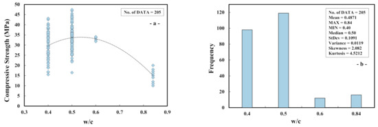 According to the comprehensive data collected from the previous analyses, the w/c of cement paste mixes adjusted with NS and MS varied from 0.4 to 0.84 with a median of 0.5. Statistical evaluation for the parameters such as variance, standard deviation, skewness, and kurtosis were 0.0119, 0.1091, 0.2.082, and 4.5212, respectively. Additionally, Figure 2a shows a difference between the compressive intensity and the w/c ratio—the histogram of modified paste mixtures with NS and MS. Figure 2b indicates that, with an improvement in the w/c of 0.55%, the compressive strength of the cement paste changed with NS and MS decreased substantially.