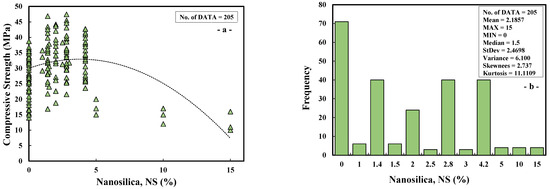 (a) The variation between the compressive strength and nanosilica (NS) and (b) histogram of nanosilica (NS) of cement paste.