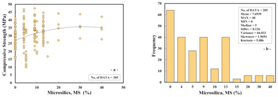 (a) The variation between the compressive strength and microsilica (MS) and (b) histogram of microsilica (MS) of cement paste.