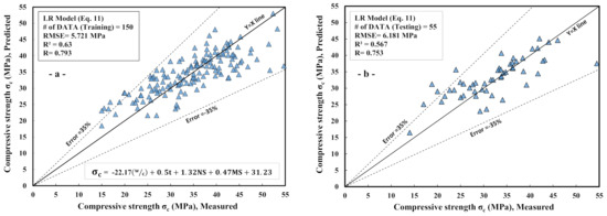 Figure 6 displays the relationship between the expected and real compressive strength of paste mixtures adjusted with NS and MS for training and testing datasets, respectively. According to the model parameters, the w/c ratio and NS material had a major effect on the compressive strength of the paste adjusted with NS and MS. The weight of each parameter on the compressive strength of paste adjusted with NS and MS was calculated for the current model by the least square approach in Excel [44,45]. The equation for the LR model could be written as follows for various weight parameters (Equation (12)).