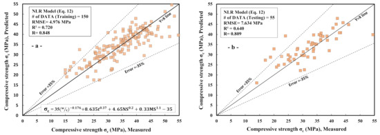 Comparison between the measured and predicted compressive strength of cement paste with nanosilica (NS) and microsilica (MS) using Non-Linear Regression model (NLR). (a) Training dataset and (b) testing dataset.