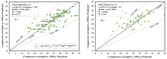 Figure 7 displays the actual compressive strength versus the predicted compressive strength based on experimental studies of paste mixtures altered with NS and MS for training and testing datasets accordingly. This model showed that the w/c ratio was the most significant parameter that influenced the compressive strength of the paste mixtures. Several previous experiments demonstrated this, in which decreases in the w/c ratio substantially increased the compressive strength of the cement paste mixtures [6,7,48,49]. The following is the suggested equation for the NLR model with various vector parameters (Equation (13)).