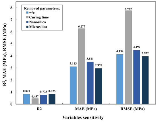 In order to understand the magnitude of the effect of each parameter on the compressive strength in the selected superior model, the following proposed method was used. Each time one of the parameters was removed from the superior model, values were obtained for each of the three criteria such as R2, RMSE, and MAE. Finally, by comparing the results, the most change would mean the highest sensitivity of the ordering parameter. In the case of R2, the lower value and, in the case of RMSE and MAE, the highest value would represent the most effective parameter.