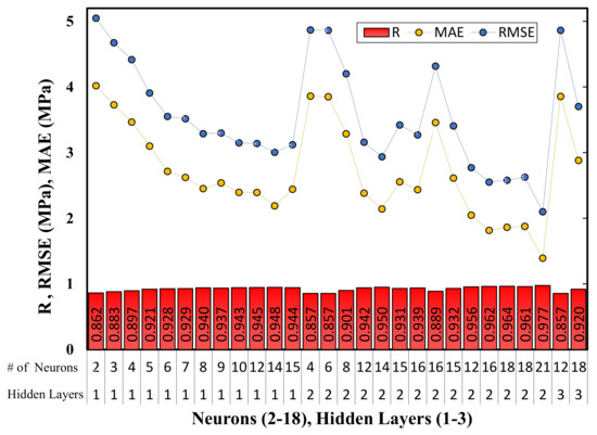A multilayer perceptron is a neural network connecting multiple layers in a directed graph, which means that the signal path through the nodes only goes one way. Apart from the input nodes, each node has a nonlinear activation function. Since there are multiple layers of neurons, ANN is a deep learning technique. ANN is widely used to solve computational neuroscience and parallel distributed processing research problems. The multilayer perceptron is an ANN feedforward class. The ANN procedure consists of three main parts: the input layer (variables), hidden layers (neurons and additional layers), and the output layer (desired output result). In this study, the main input variables of Equations (5) and (6) involved water-cement ratio, curing days, and additives (nanosilica and microsilica).