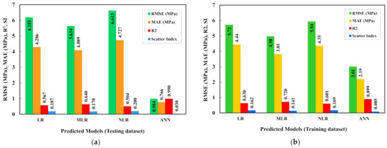 Statistical assessments to evaluate the efficiency of models used in this study. (a) Training dataset and (b) testing dataset.