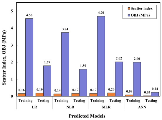 The OBJ value of training and testing for all proposed models is given in Figure 14 separately. The total OBJ (total of training and testing objective) values for LR, NLR, MLR, and ANN were 6.35, 5.33, 6.72, and 2.24, respectively, which also demonstrated overall that the ANN model was more efficient regarding the estimation of the compressive strength of paste mixtures modified with NS and MS.