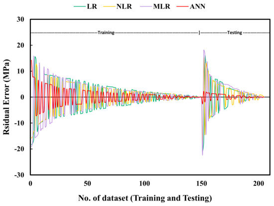 As stated earlier, five distinct statistical techniques were used to evaluate the suggested models’ efficiency: RMSE, SI MAE, R2, and OBJ. The ANN model had a higher R2 with lower RMSE and MAE values among the four different models compared to the LR, NLR, and MLR models (Figure 13). Additionally, Figure 14 presents the SI and OBJ together to compare the model estimations of the compressive strength of paste mixes using training and testing data. At a glance, the ANN model was the best one of the prediction models, with the lowest scatter index (<0.1—excellent performance) and the shortest bars for OBJ parameters in both training and testing. Moreover, Figure 15 and Figure 16 affirm that the ANN model had the lowest oscillation range of residual error compared to other models. All the mentioned figures showed that the predicted and measured values of compressive strength were more closed for the ANN model, indicating the superior performance of the ANN model compared to other models.