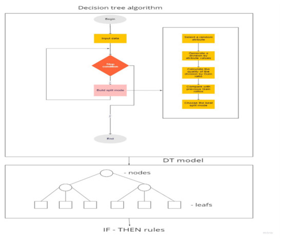 The DT algorithm also generates relative frequencies for each leaf, i.e., the probability of belonging to the class that this leaf represents (Rule accuracy). The tree induction process recursively divides the initial data set into subsets. The goal of each iteration is to get the best possible division. The separation method may differ depending on the DT algorithm itself, which defines the variable to be assigned to the node in the tree. Each branch of the tree that emerges from that node corresponds to one of the obtained subgroups. When a tree is generated on an entire data set with a categorical target variable, then the model allows classification because the initial data set is divided into classes (defined by the values of the target variable), and each class is assigned an appropriate classification rule to read from the tree. We emphasize that not all rules have the same meaning. More important are those rules whose leaf contains several examples of the class represented by that leaf.